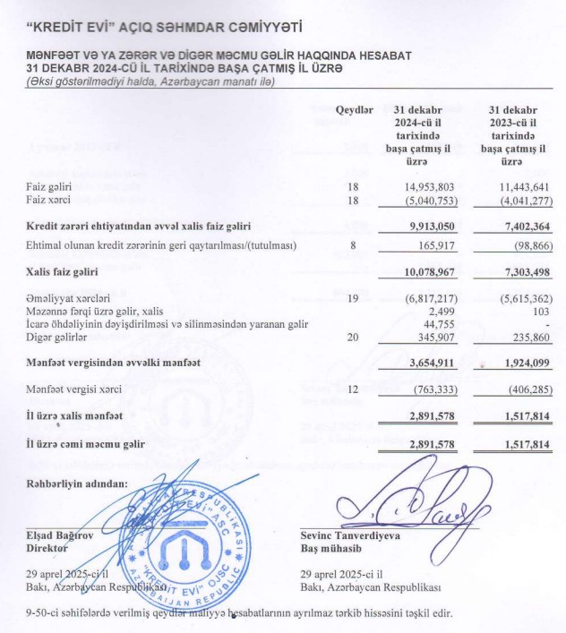 Marja.az şirkətin illik hesabatına istinadən xəbər verir ki, "Kredit Evi"nin faiz gəlirləri 2023-cü idlə 11 milyon 443 min manat ikən, 2024-cü ildə 14 milyon 953 min manata yüksəlib (3 milyon 510 min manat və ya 30,7% artıb). Ötən il Şirkətin faiz xərcləri isə 1 milyon manat və ya 24,7% artaraq 5 milyon 41 min manata təşkil edib.