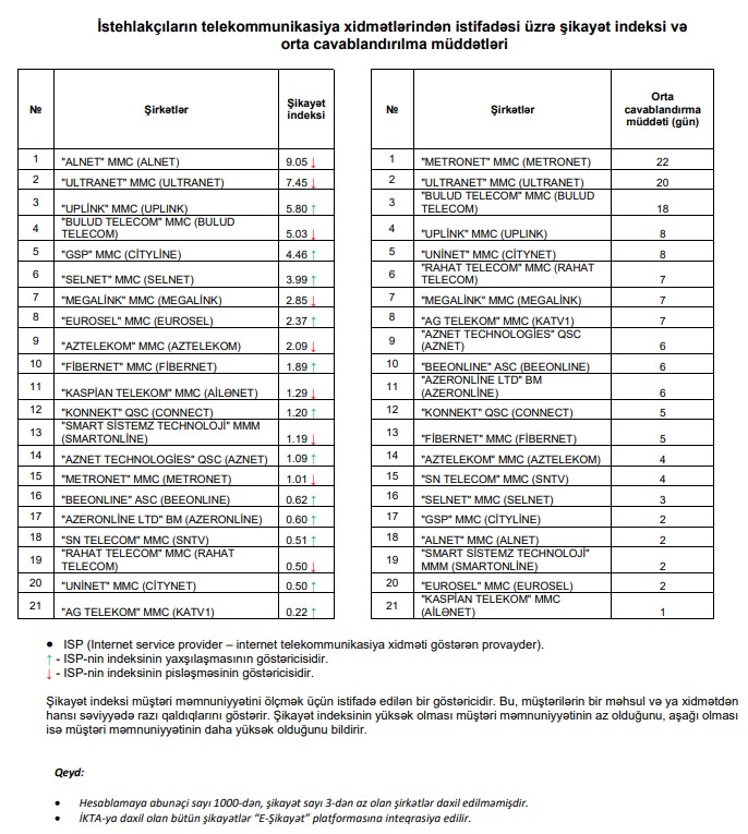 İnternet istifadəçiləri ən çox "Alnet", "Ultranet" və "Uplink"dən narazıdırlar.Azərbaycanın telekommunikasiya və poçt sahələrində tənzimləyici qurumu İnformasiya Kommunikasiya Texnologiyaları Agentliyi (İKTA) abunəçilərin internet xidmətlərindən istifadəsi üzrə növbəti şikayət indeksi və şikayətlərin orta cavablandırılma müddəti hesabatını dərc edib.