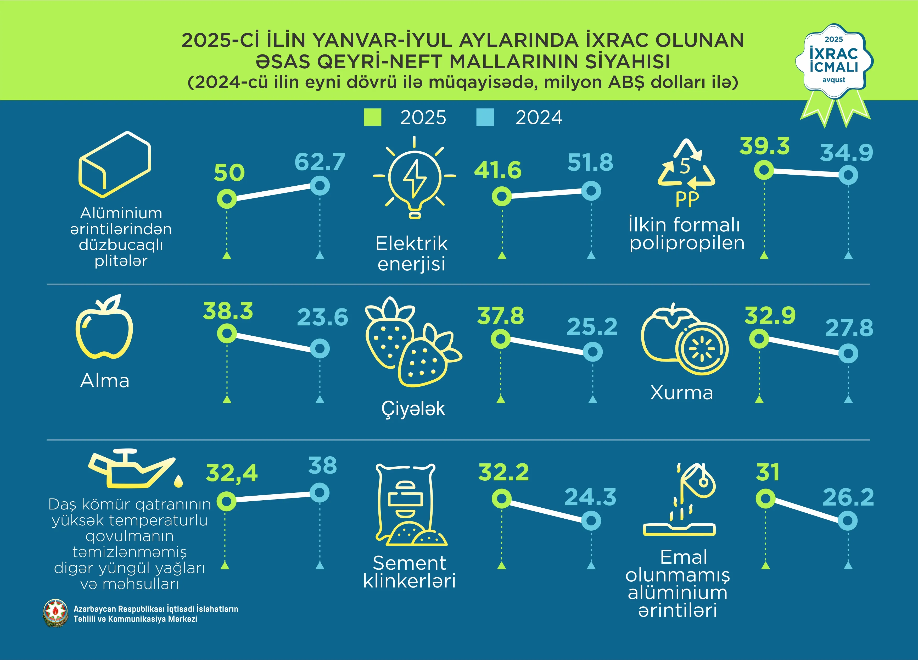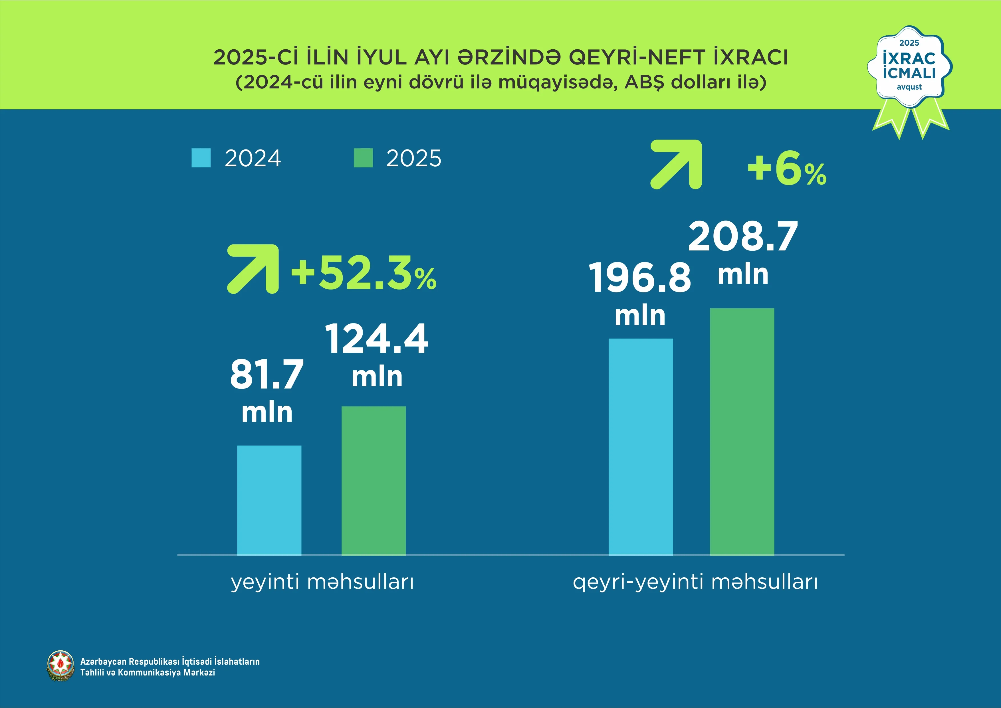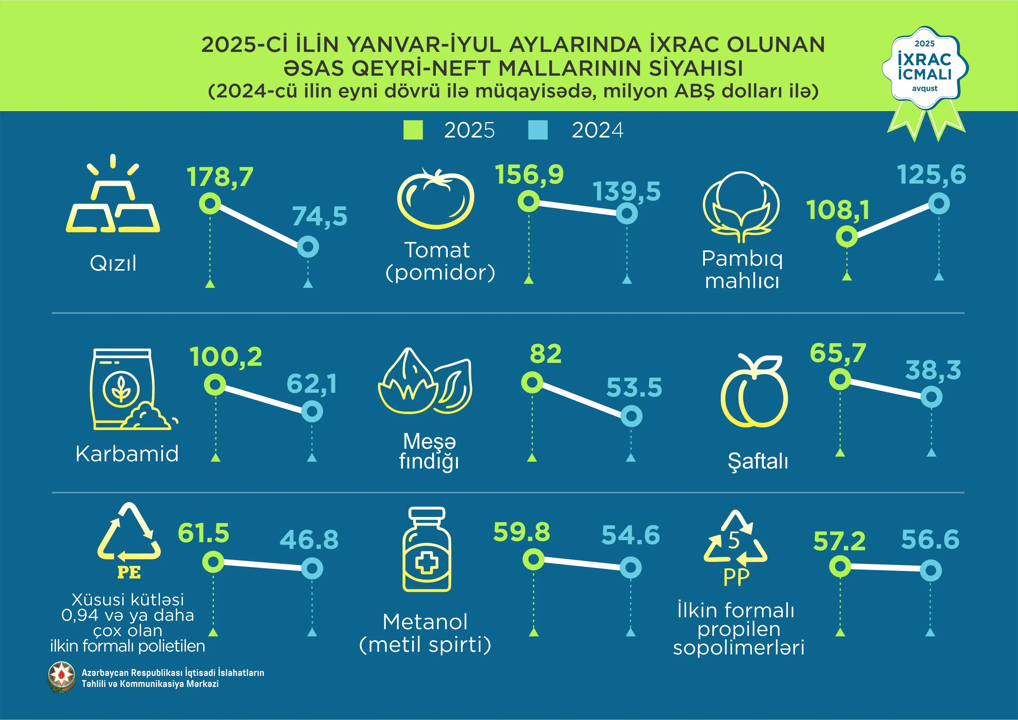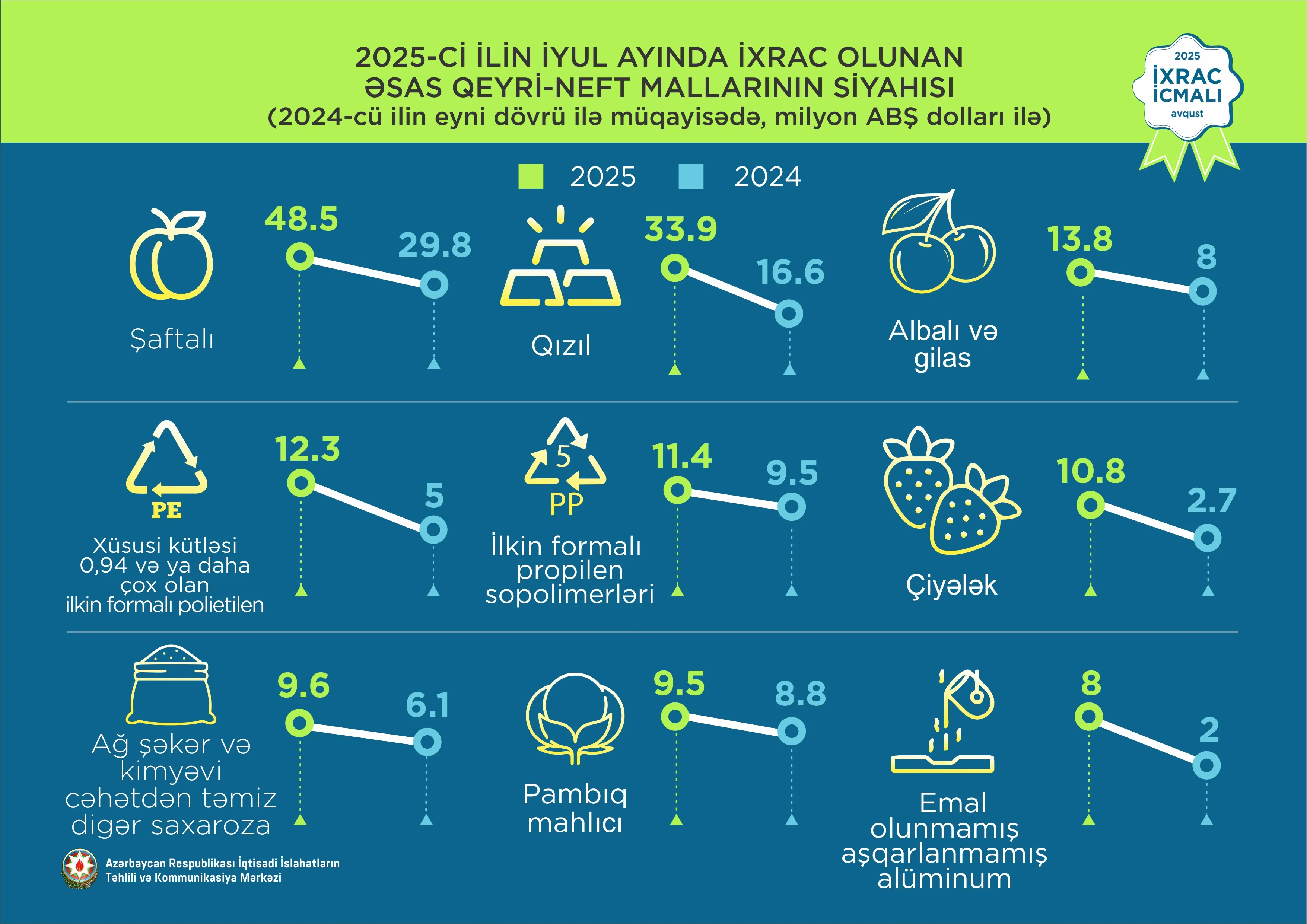 2025-ci ilin iyul ayı ərzində ixrac edilmiş qeyri-neft sektoruna aid malların siyahısında şaftalı (48,5 milyon ABŞ dolları) birinci olub. Bu siyahıda qızıl (33,9 milyon ABŞ dolları) ikinci, daş kömür qatranının yüksək temperaturlu qovulmanın təmizlənməmiş digər yüngül yağları və məhsulları (13,8 milyon ABŞ dolları) isə üçüncü yerdə qərarlaşıb.