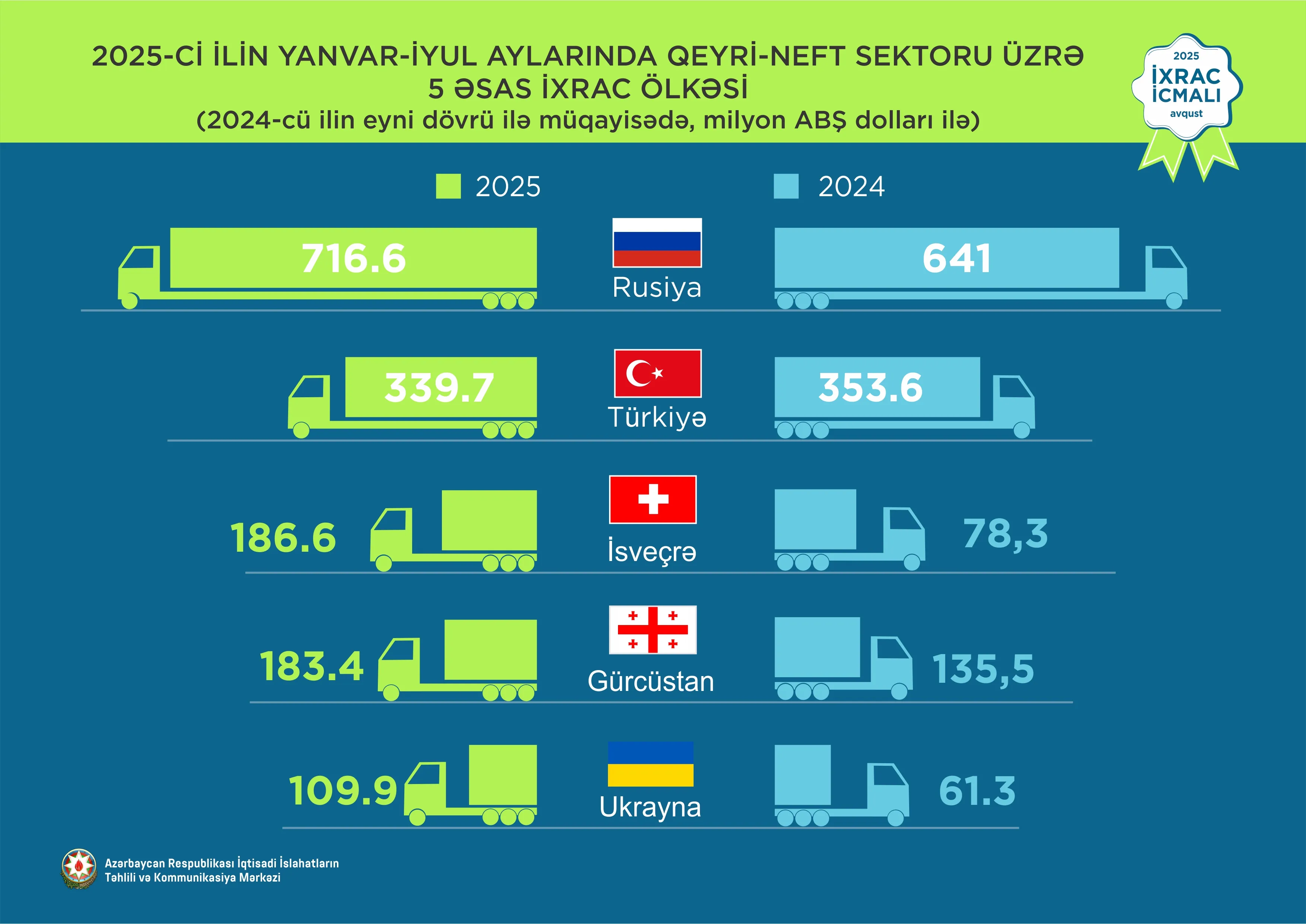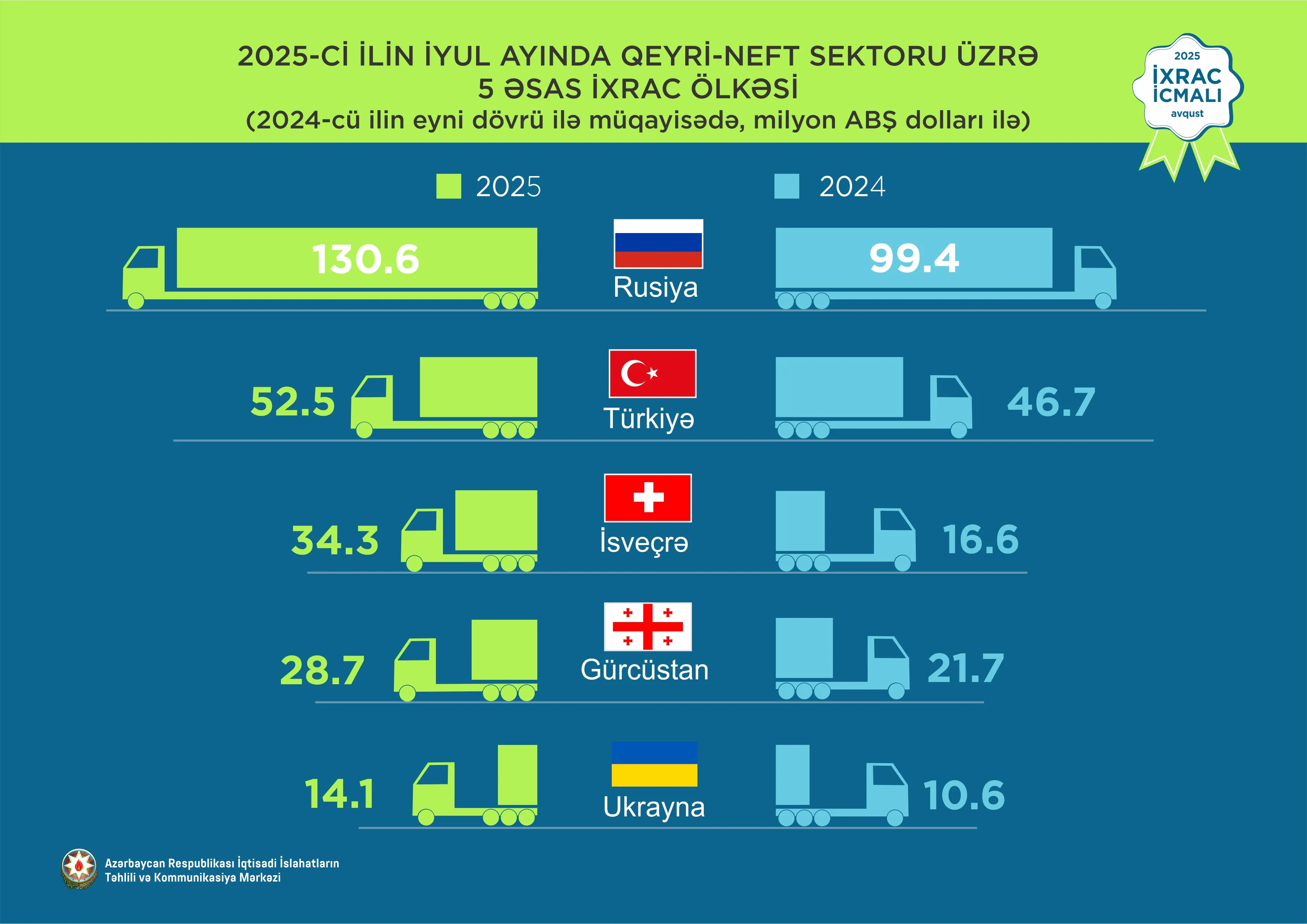 2025-ci ilin iyul ayında Rusiya Federasiyasına 130,6 milyon ABŞ dolları, Türkiyəyə 52,5 milyon ABŞ dolları, İsveçrəyə 34,3 milyon ABŞ dolları, Gürcüstana 28,7 milyon ABŞ dolları, Ukraynaya isə 14,1 milyon ABŞ dolları dəyərində qeyri-neft sektoruna aid mal ixrac edilib.