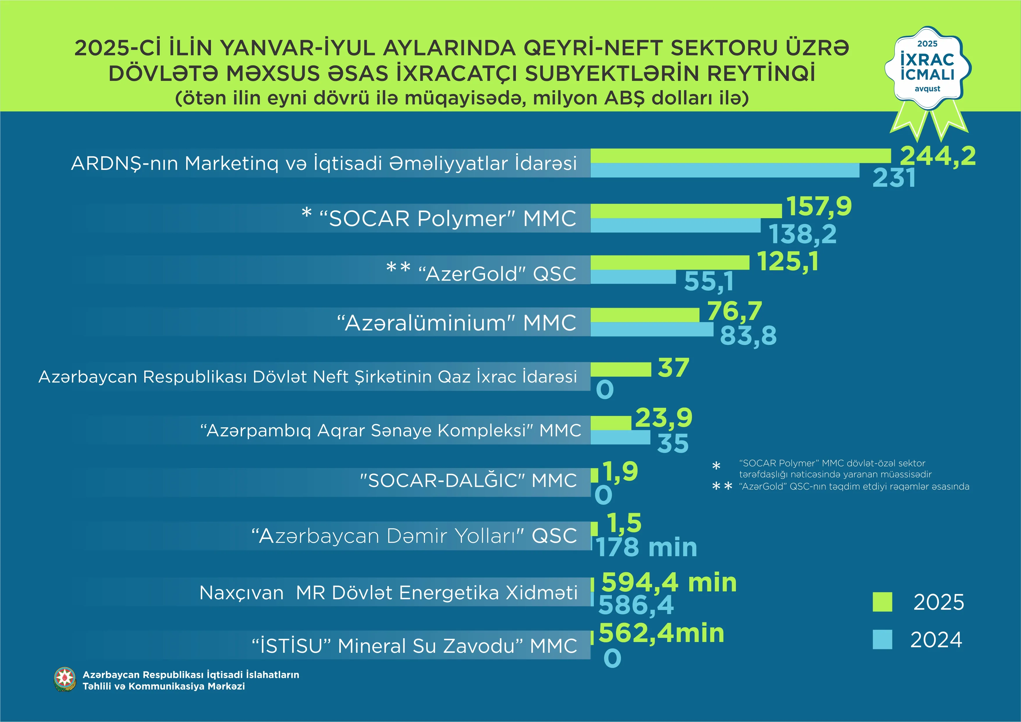 Marja xəbər verir ki, 2025-ci ilin yanvar-iyul ayları üzrə hazırlanmış qeyri-dövlət ixracatçı subyektlərin reytinqində ilk onluqda aşağıdakı şirkətlər təmsil olunublar: