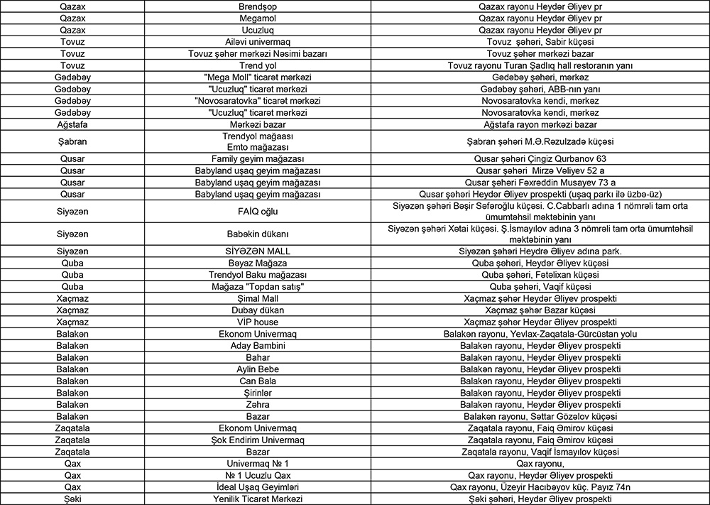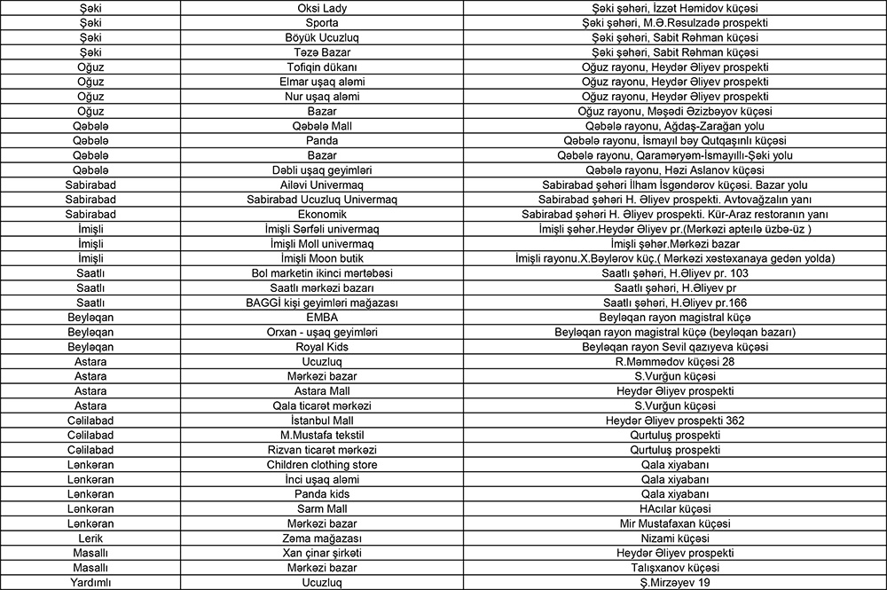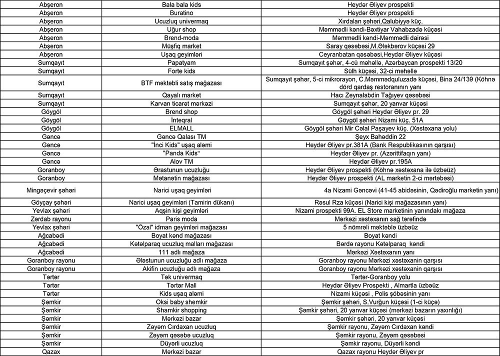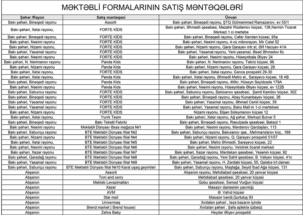 Ümumi təhsil müəssisələrində tətbiq edilən vahid məktəbli geyimlərinin əldə edilməsinin asanlaşdırılması və valideynlər üçün əlçatanlığın təmin edilməsi məqsədilə ölkə üzrə satış məntəqələrinin ünvanları təqdim edilib. Vətəndaşlar qeyd edilən, eləcə də ölkəmizin şəhər və rayonlarında fəaliyyət göstərən istənilən satış məntəqələrinə müraciət edə bilərlər.