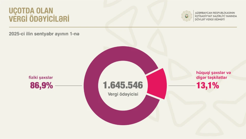 Vergi ödəyicilərinin sayı 4,8 faiz artıb2025-ci ilin sentyabr ayının 1-nə respublika üzrə uçotda olan 1 milyon 645 min 546 vergi ödəyicisinin 86,9 faizi fiziki şəxs, 13,1 faizi hüquqi şəxs və digər təşkilatlar olub.