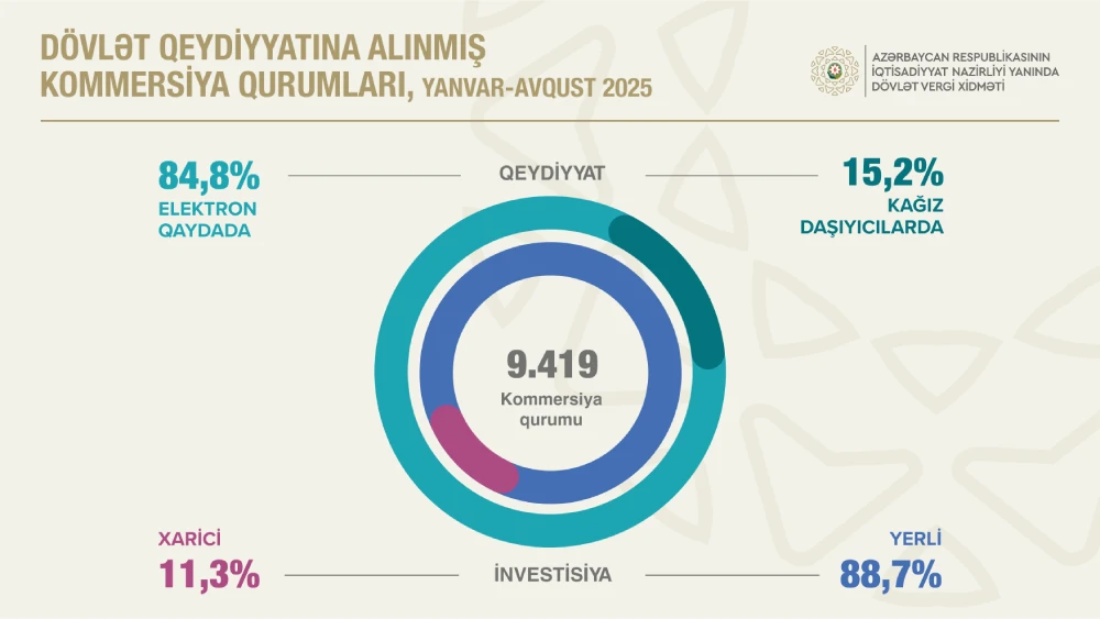 Sentyabr ayının 1-nə qeydiyyatda olan kommersiya qurumlarının sayı ötən ilin müvafiq dövrü ilə müqayisədə 8 faiz artaraq 199 min 530 vahid təşkil edib. 2025-ci ilin yanvar-avqust aylarında 9 min 419 vahid kommersiya qurumu dövlət qeydiyyatından keçib ki, bunun da 88,7 faizi yerli investisiyalı, 11,3 faizi xarici investisiyalıdır.