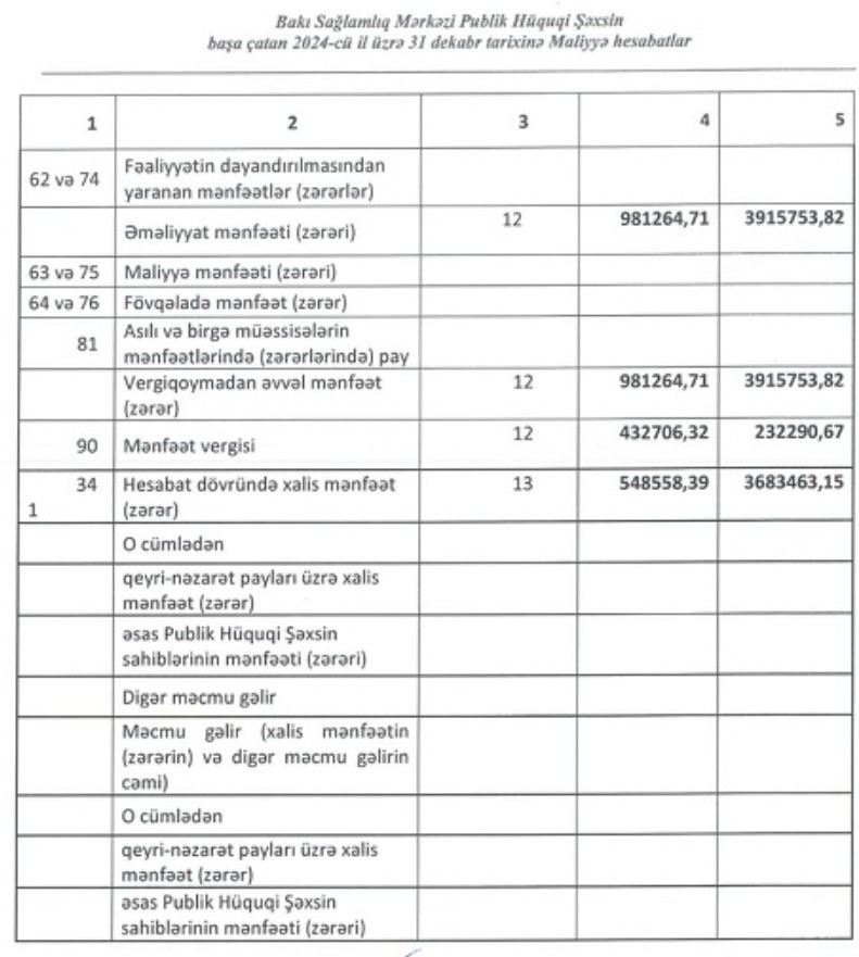 Bakı Sağlamlıq Mərkəzi 981 min manat əməliyyat mənfəətindən 433 min manat mənfəət vergisi ödəyib.