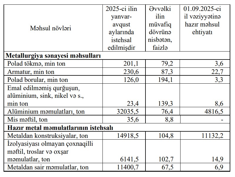 2025-сi ilin yanvar-avqust aylarında armatur istehsalı 12,7 faiz, polad tökmə istehsalı 20,8 faiz, mis məftil istehsalı 91,2 faiz, hazır metal məmulatlarının istehsalı sahəsi üzrə metaldan sair məmulatların istehsalı isə 32,5 faiz azalmışdır.