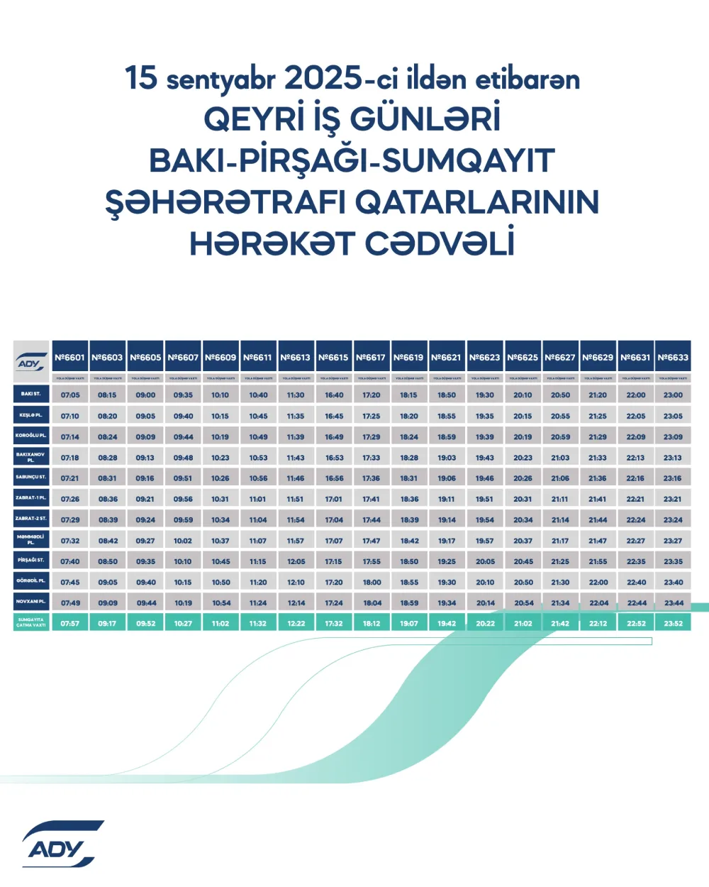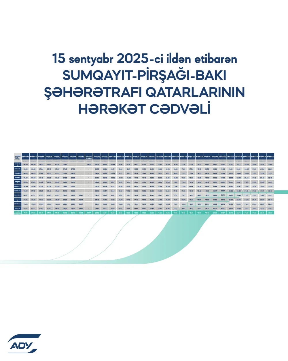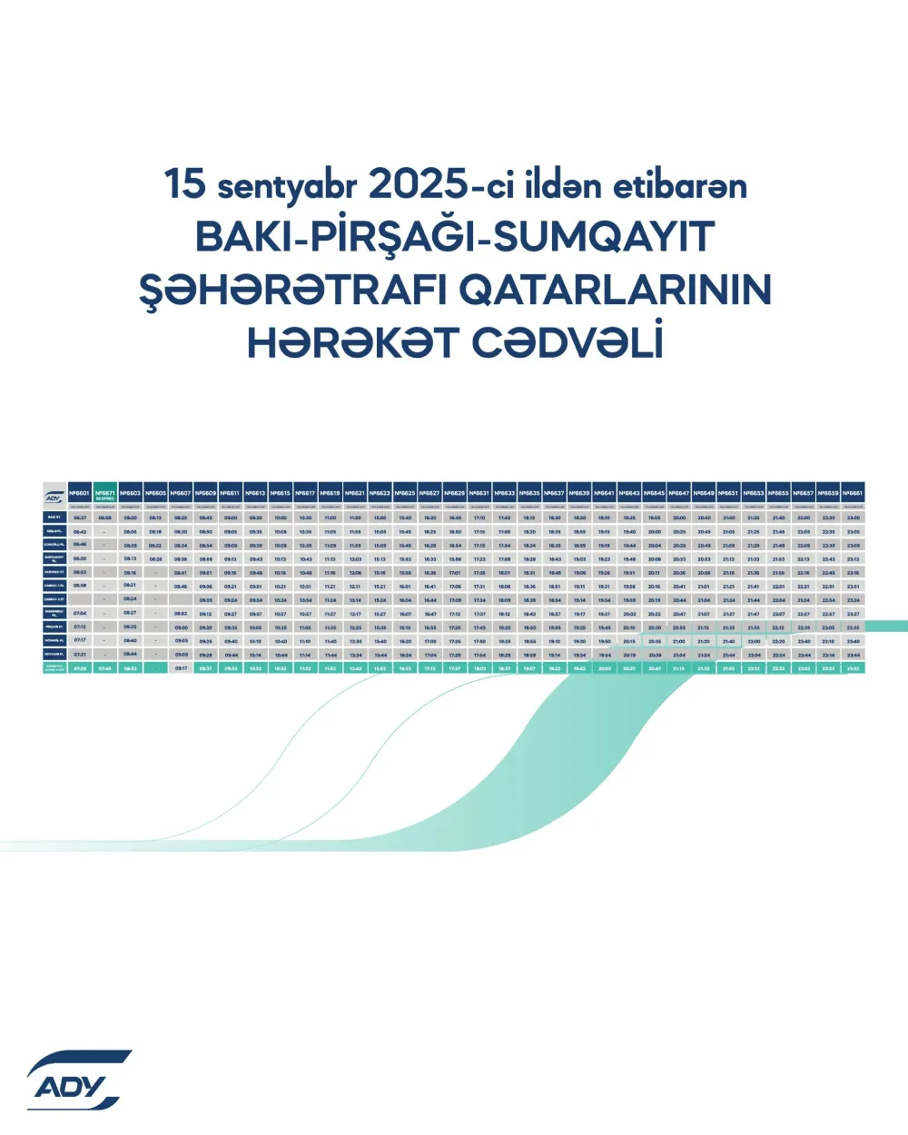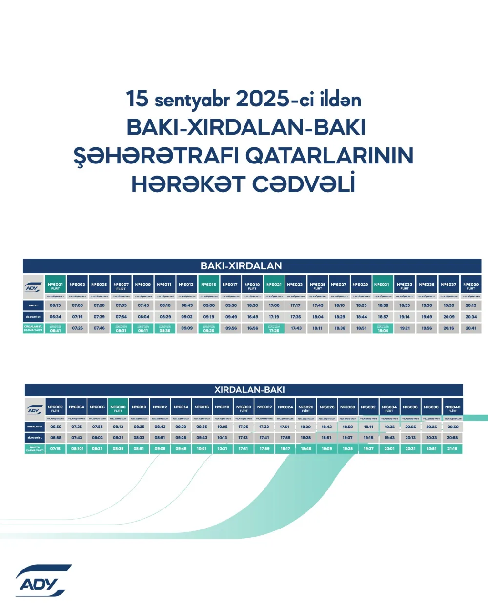 “Azərbaycan Dəmir Yolları” QSC-nin (ADY) Abşeron dairəvi dəmir yolu marşrutu üzrə hərəkət edən qatarları sərnişin tələbatını təmin etmək məqsədilə 15 sentyabr 2025-ci il tarixindən yenilənmiş hərəkət cədvəli ilə xidmət göstərəcək.