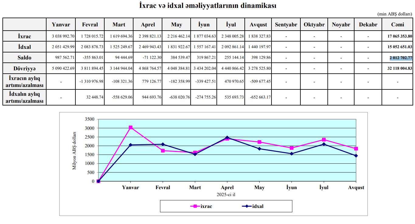 01.01.2025 – 31.08.2025 dövründə (8 ayda) Azərbaycanın xarici ticarət əməliyyatlarının həcmi 32 milyard 118 milyon 5 min ABŞ dolları, o cümlədən ixracın həcmi 17 milyard 65 milyon 354 min ABŞ dolları, idxalın həcmi 15 milyard 52 milyon 651 min ABŞ dolları, saldo müsbət 2 milyard 12 milyon 703 min ABŞ dolları təşkil edib.