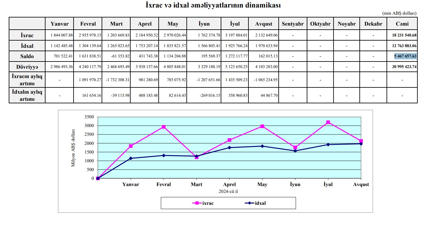 Xatırladaq ki, 01.01.2024 – 31.08.2024 dövründə Azərbaycanın xarici ti carət əməliyyatlarının həcmi icarət əməliyyatlarının həcmi 30 milyard 995 milyon 424 min ABŞ dolları o cümlədən, ixracın həcmi 18 milyard 231 milyon 541 min ABŞ dolları, idxalın həcmi 12 milyard 763 milyon 883 min ABŞ dolları, saldo müsbət 5 milyard 467 milyon 658 min ABŞ dolları təşkil etmişdi.