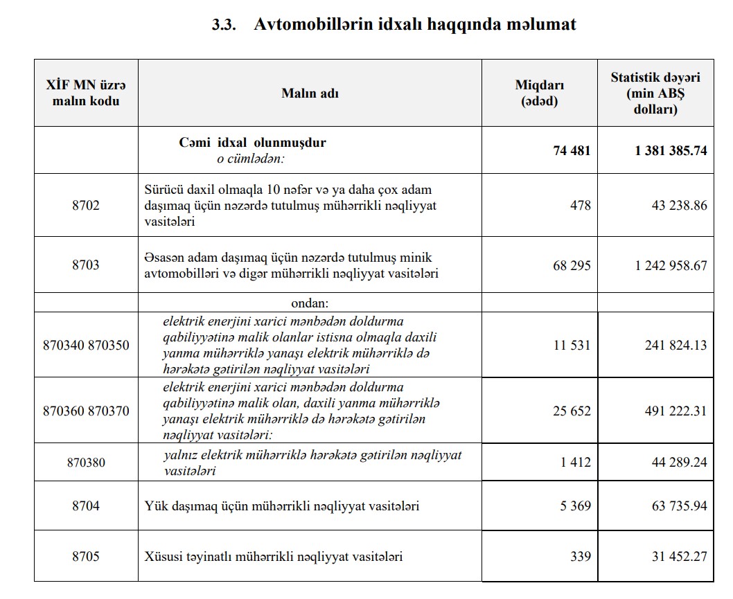 2025-ci ilin 8 ayı ərzində (yanvar-avqust) Azərbaycana 1 milyard 381 milyon 386 min dollar (cari məzənnə ilə 2 milyard 348 milyon manat) dəyərində 74 min 481 ədəd avtomobil idxal olunub. Başqa sözlə, ölkəmizə hər ay orta hesabla 9 min 310 ədəd avtomobil gətirilib.