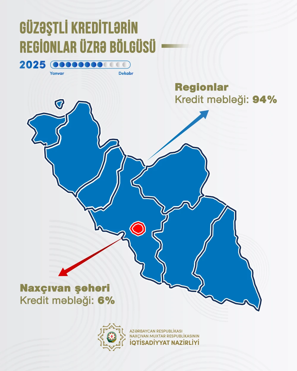 2025-ci ilin ilk səkkiz ayında Naxçıvan Muxtar Respublikası Sahibkarlığın İnkişafı Fondu tərəfindən maliyyələşdirilən güzəştli kredit məbləğinin 94 faizi regionda yaşayan sahibkarların payına düşüb.