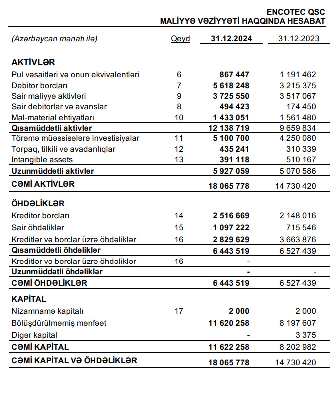 31 dekabr 2024-cü il tarixində "Encodec" şirkəti 18 milyon 66 min manat cəmi aktivlərə malik olub. Şirkət 2023-cü ilin sonunda 14 milyon 730 min manat cəmi aktivlərə malik idi.