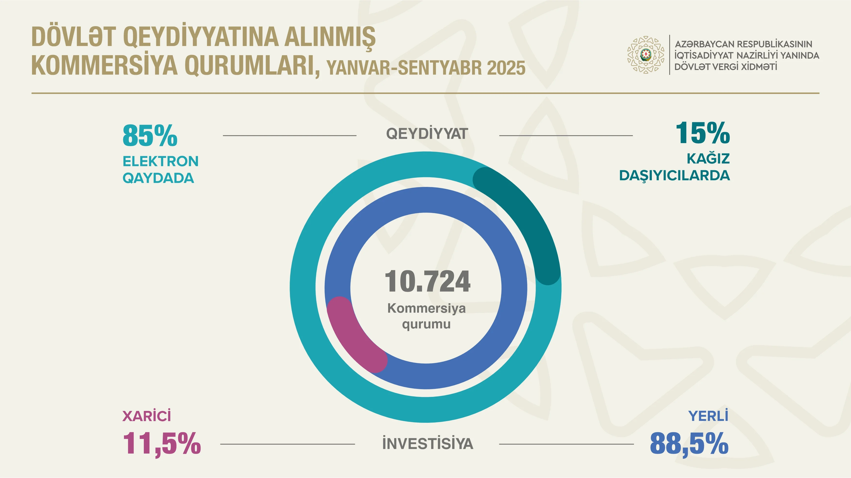 Oktyabr ayının 1-nə qeydiyyatda olan kommersiya qurumlarının sayı ötən ilin müvafiq dövrü ilə müqayisədə 7,8 faiz artaraq 200 min 806 vahid təşkil edib. 2025-ci ilin yanvar-sentyabr aylarında 10 min 724 vahid kommersiya qurumu dövlət qeydiyyatından keçib ki, bunun da 88,5 faizi yerli investisiyalı, 11,5 faizi xarici investisiyalıdır.