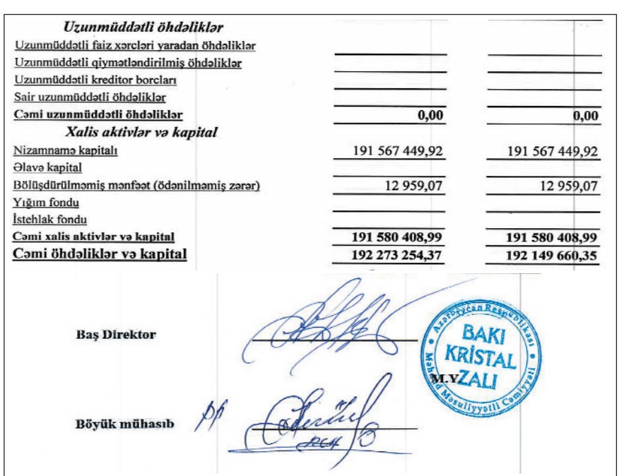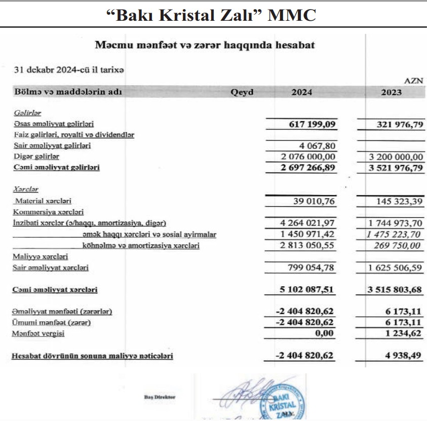 Ötən il Şirkətin cəmi əməliyyat gəlirləri 3 milyon 522 min manat, cəmi əməliyyat xərcləri 5 milyon 102 min manat təşkil edib. Başqa sözlə, "Bakı Kristal Zalı"nın gəlirləri xərclərini ödəmir."Bakı Kristal Zalı" MMC 2024-cü ili 2 milyon 405 min manat xalis zərər ilə başa vurub. Halbuki, şirkət 2023-cü ili 4938 manat xalis mənfəət ilə bağlamışdı. "Bakı Kristal Zalı"nın zərər ilə üzləşməsi gəlirlərinin azalması ilə bərabər xərclərinin də artmasıdır.