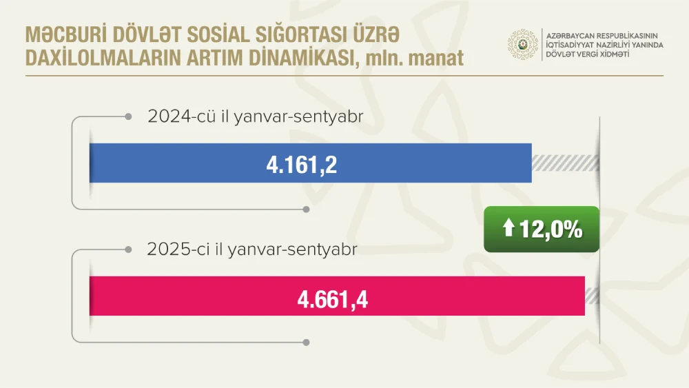 2025-ci ilin yanvar – sentyabr aylarında muzdlu işçi sayının və əməkhaqqı fondunun “ağarması” prosesi şəraitində məcburi dövlət sosial sığorta haqları üzrə daxilolmalar 4 milyard 661,4 milyon manat təşkil edib. Bu mənbədən daxilolmalar əvvəlki ilin müvafiq dövrü ilə müqayisədə 12 faiz və ya 500,1 milyon manatdan çox artıb. Qeyri-büdcə təşkilatları üzrə daxilolmalar ötən ilin eyni dövrü ilə müqayisədə 13,0 faiz artaraq 3 milyard 113,2 milyon manat olub.