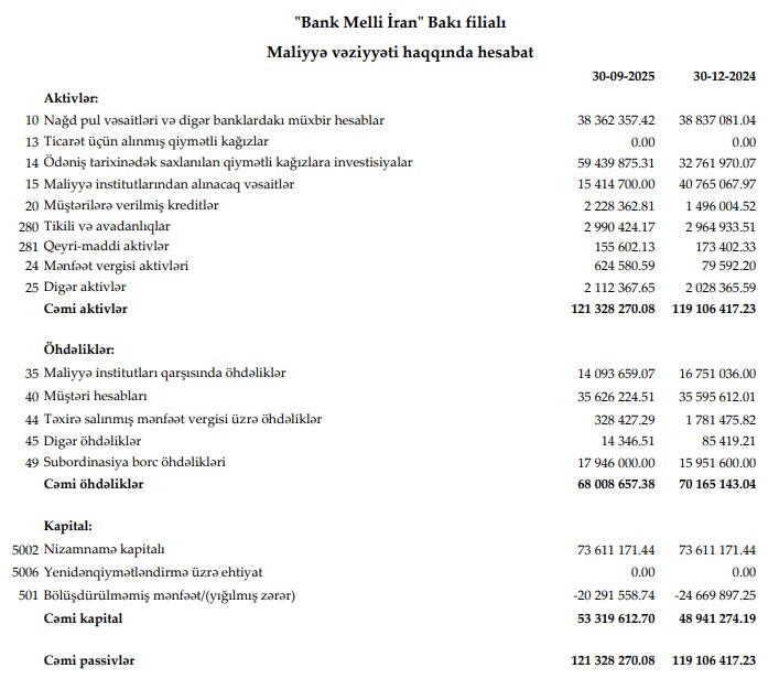 30 Sentyabr 2025-ci il tarixində "Bank Melli İran" Bakı filialı 121 milyon 328 min manat cəmi aktivlərə malikolub. Bank ötən ilin sonunda 119 milyon 106 min manat cəmi aktivlərə malik idi.