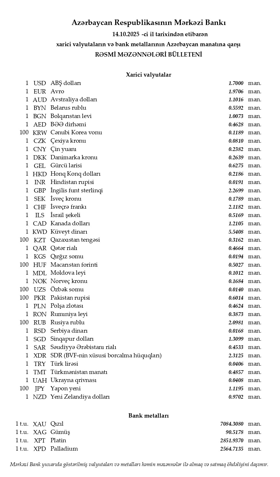 Rəsmi məzənnələr açıqlandı