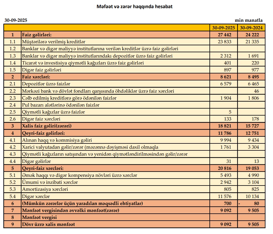 2025-cü ilin 9 ayında ilin əvvəli ilə müqaisədə fiziki şəxsərin depozitləri 9 milyon 986 min manat artaraq 302 milyon 41 min manata çatmış, hüquqi şəxslərin depozitlərində isə 9 milyon 394 min manat azalaraq 76 milyon 312 min manat təşkil etmişdir.