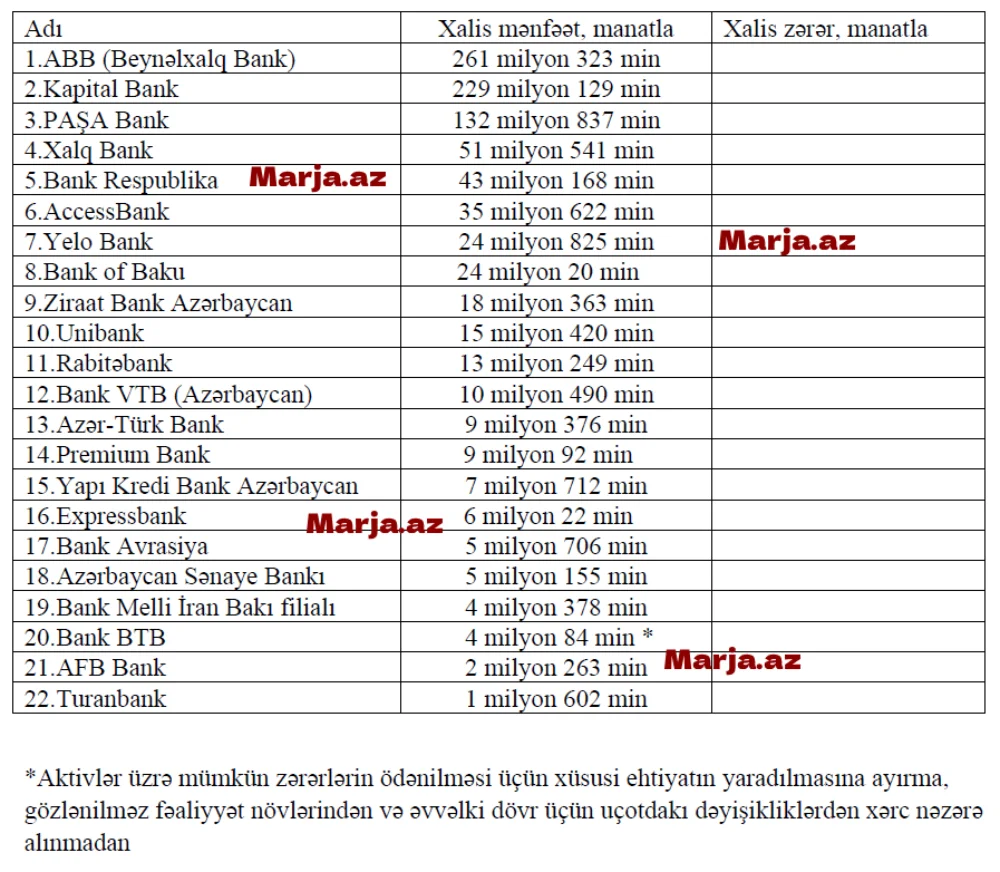 Bankların adları və mənfəət məbləğləri ilə aşağıdakı cədvəldən tanış ola bilərsiniz.