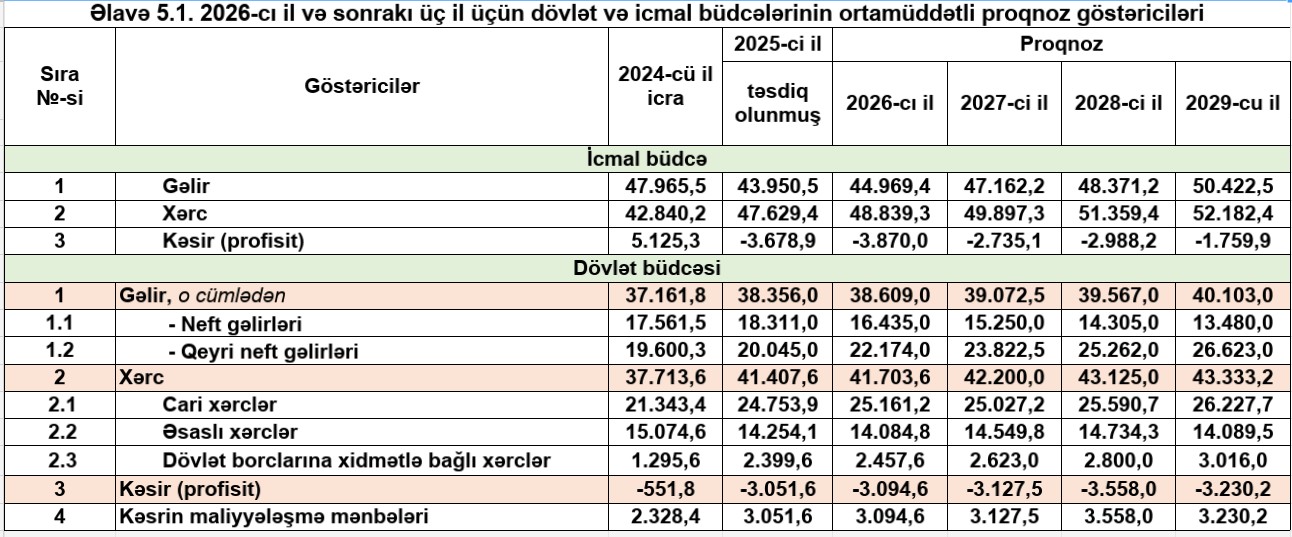 2028-ci il: gəlir – 48 milyard 371 milyon manat, xərc – 51 milyard 359 milyon manat;