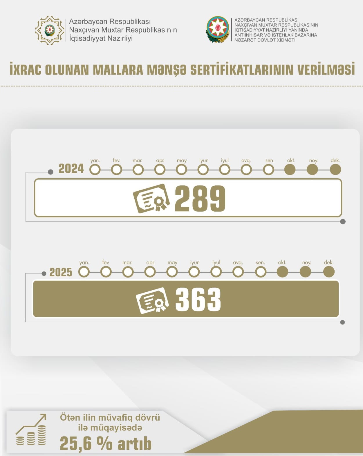 Naxçıvan Muxtar Respublikasının İqtisadiyyat Nazirliyi yanında Antiinhisar və İstehlak Bazarına Nəzarət Dövlət Xidmətindən verilən məlumata görə, mənşə sertifikatları əsasən tikinti, mineral sular, meyvə-tərəvəz, tütün məmulatları və digər məhsulların ixracı üçün təqdim olunub.