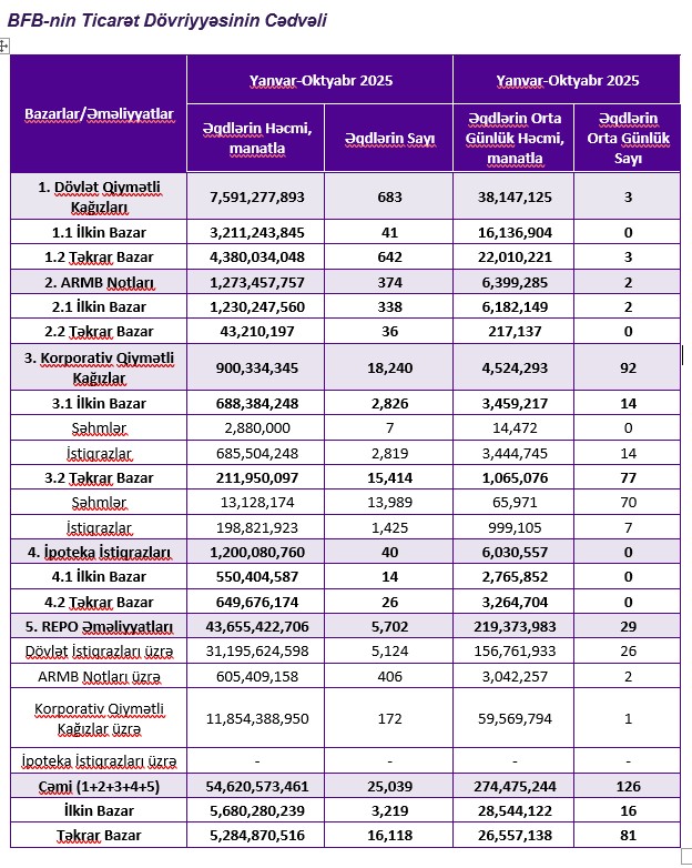 Bakı Fond Birjasının dövriyyəsi 9 faizə yaxın artıb.2025-ci ilin 10 ayı ərzində (yanvar-oktyabr) Bakı Fond Birjasında (BFB) ticarət dövriyyəsinin məbləği 54 milyard 620 milyon 573 min manat təşkil edib.