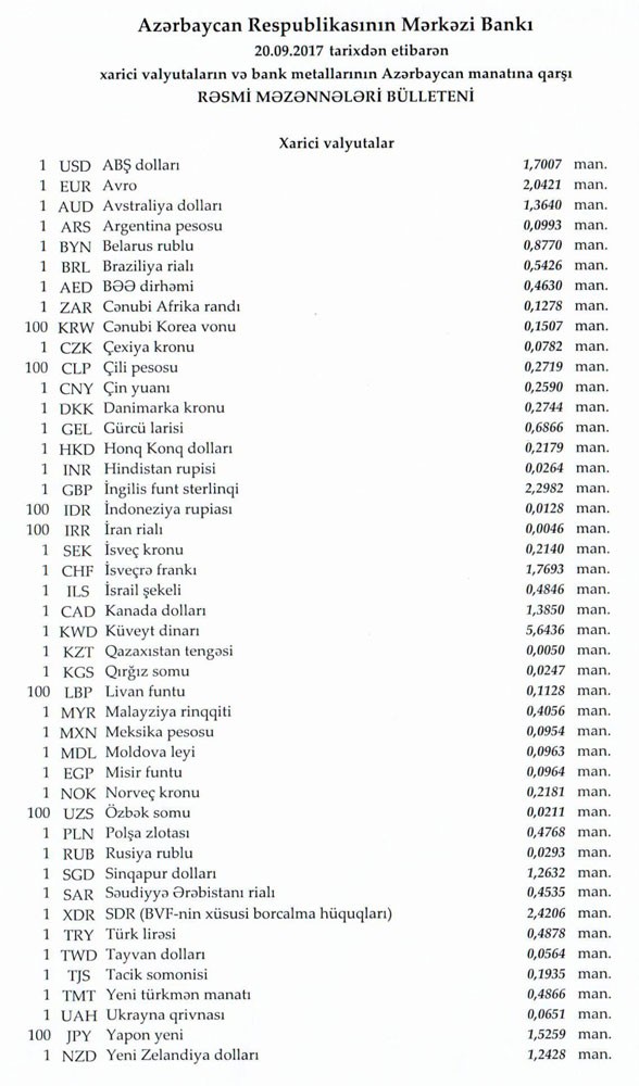 Sentyabrın 19-da rəsmi olaraq 1 dollar 1,7007 manata, 1 avro isə 2.0368 manata bərabər idi.