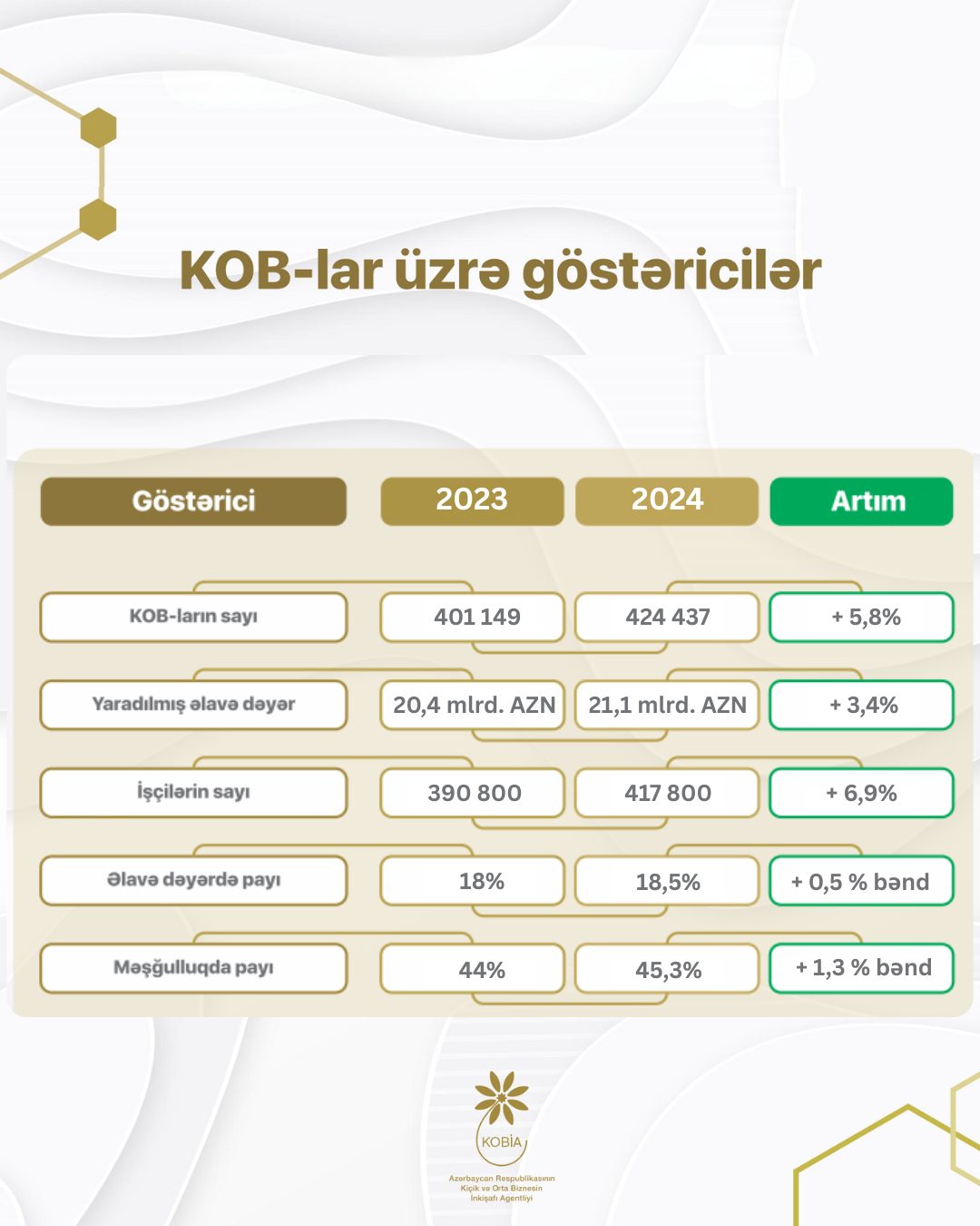 Dövlət Statistika Komitəsinin məlumatına əsasən 2024-cü ildə KOB-ların sayı 424 min 437 olub ki, bu əvvəlki illə müqayisədə 5,8% çoxdur. 2023-cü illə müqayisədə ötən il KOB-ların yaratdığı əlavə dəyərin həcmi 3,4% artaraq 21,1 milyard manat təşkil edib.