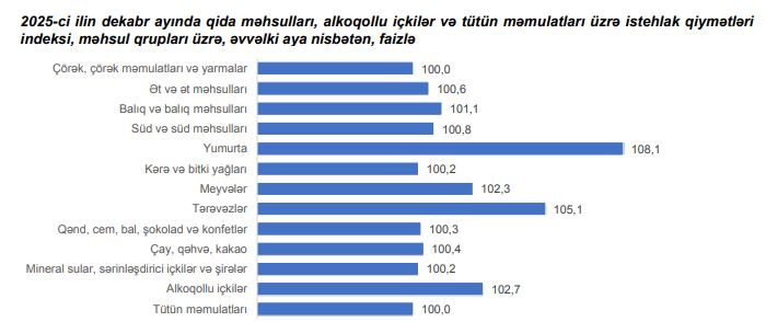 2025-ci ilin dekabr ayında qida məhsulları, alkoqollu içkilər və tütün məmulatları üzrə istehlak qiymətləri indeksi əvvəlki aya nisbətən 1,4 faiz, yanvar-dekabr aylarında isə əvvəlki ilin müvafiq dövrünə nisbətən 6,8 faiz yüksəlib.