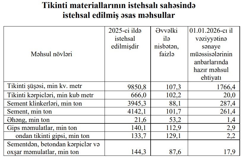 Tikinti materiallarının istehsalı sahəsində 2025-сi ildə istehsalın ümumi dəyəri 1462,3 milyon manat olmaqla, əvvəlki illə müqayisədə 4,3 faiz azalmışdır. Dövr ərzində beton istehsalı 10,7 faiz, sementdən, betondan kərpiclər və oxşar məmulatların istehsalı 12,4 faiz, əhəng istehsalı isə 46,8 faiz azalıb.