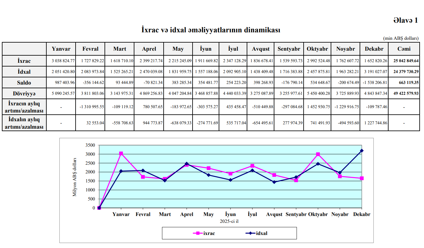 O cümlədən, 2025-ci ildə idxal əməliyyatları üzrə 24 milyard 379 milyon 730 min ABŞ dolları, ixrac əməliyyatları üzrə 25 milyard 42 milyon 850 min ABŞ dolları ticarət qeydə alınıb, saldo müsbət 663 milyon 119 min ABŞ dolları olub.