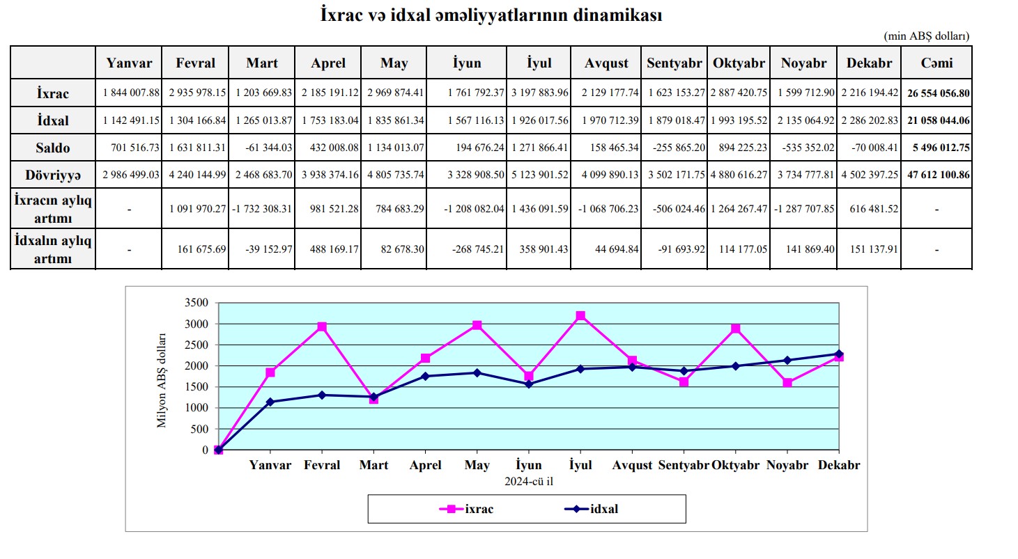 Xatırladaq ki, 2024-cü ildə Azərbaycanın xarici ticarət əməliyyatlarının həcmi 47 milyard 612 milyon 101 min ABŞ dolları, o cümlədən, idxal əməliyyatlarının cəmi dəyəri 21 milyard 58 milyon 44 min ABŞ dolları, ixrac əməliyyatlarının cəmi dəyəri 26 miilyard 554 milyon 57 min ABŞ dollar, saldo müsbət 5 milyard 496 milyon 13 min ABŞ dolları təşkil etmişdi.
