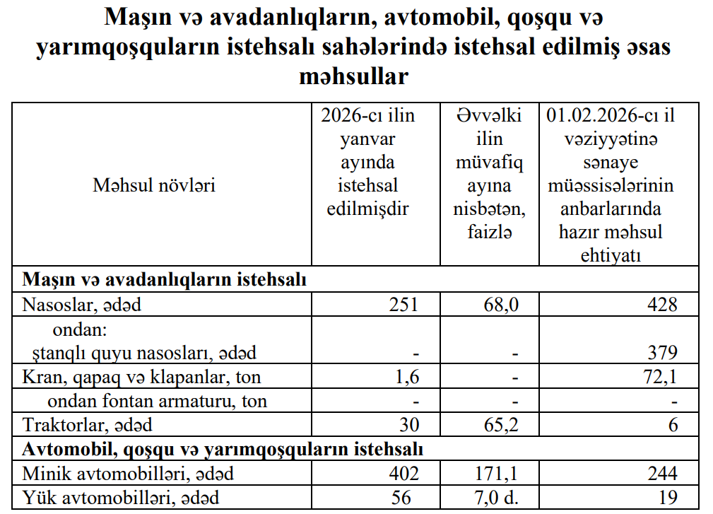 2026-сı ilin yanvar ayında Azərbaycanda 402 ədəd minik avtomobili istehsal olunub.