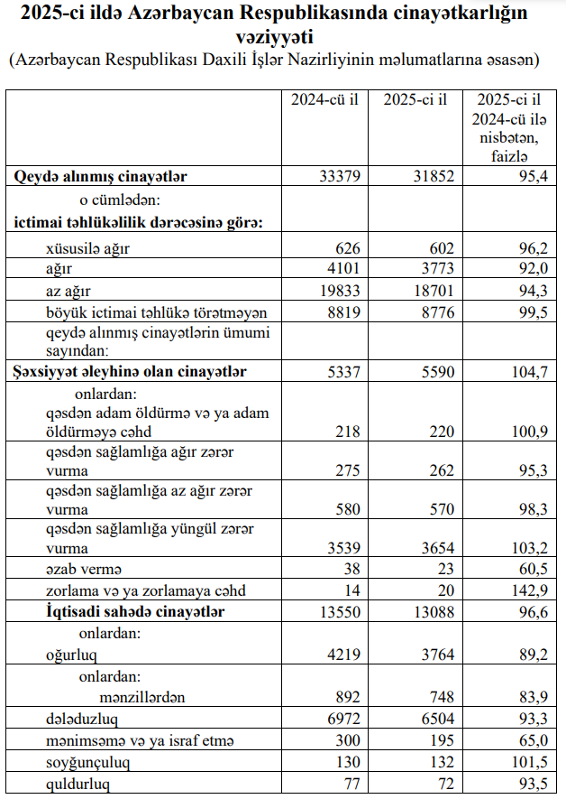 2025-ci ildə əvvəlki illə müqayisədə mənimsəmə və ya israf etmə 35 faiz, kibercinayətlər 27,3 faiz azalıb, torpaq üzərində mülkiyyət, istifadə və ya icarə hüququnu pozma 3 dəfə, vergiləri, işsizlikdən sığorta, icbari tibbi sığorta və ya məcburi dövlət sosial sığorta haqlarını ödəməkdən yayınma 50,4 faiz, cinayət yolu ilə əldə edilmiş əmlakı leqallaşdırma 38,2 faiz, qaçaqmalçılıq 8,4 faiz artıb.Azərbaycan Respublikası Daxili İşlər Nazirliyinin məlumatlarına əsasən, 2025-ci il ərzində ölkədə 31 min 852 cinayət hadisəsi qeydə alınmışdır ki, bu da 2024-cü ilin göstəricisindən 4,6 faiz azdır.