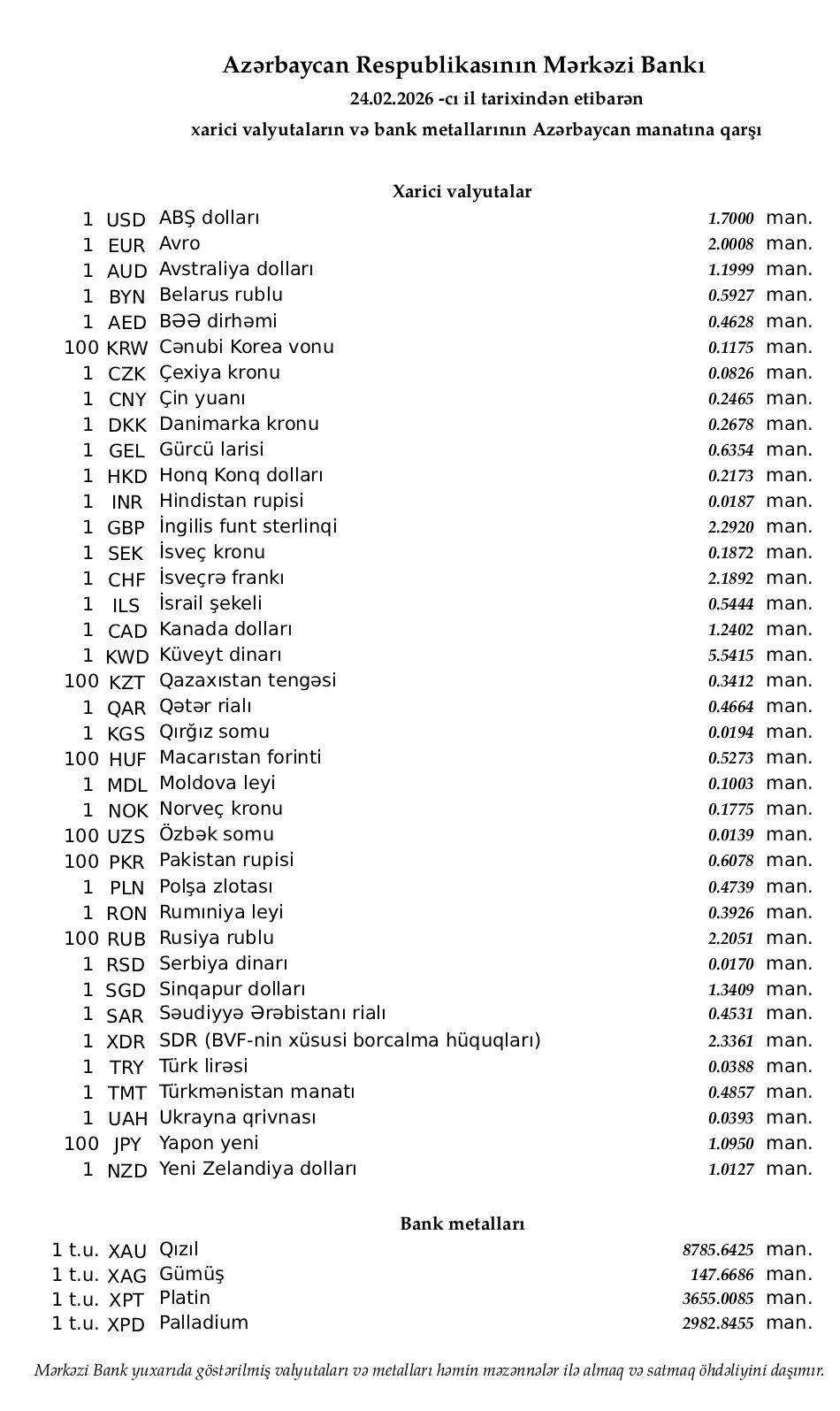 Rəsmi məzənnələr açıqlandı