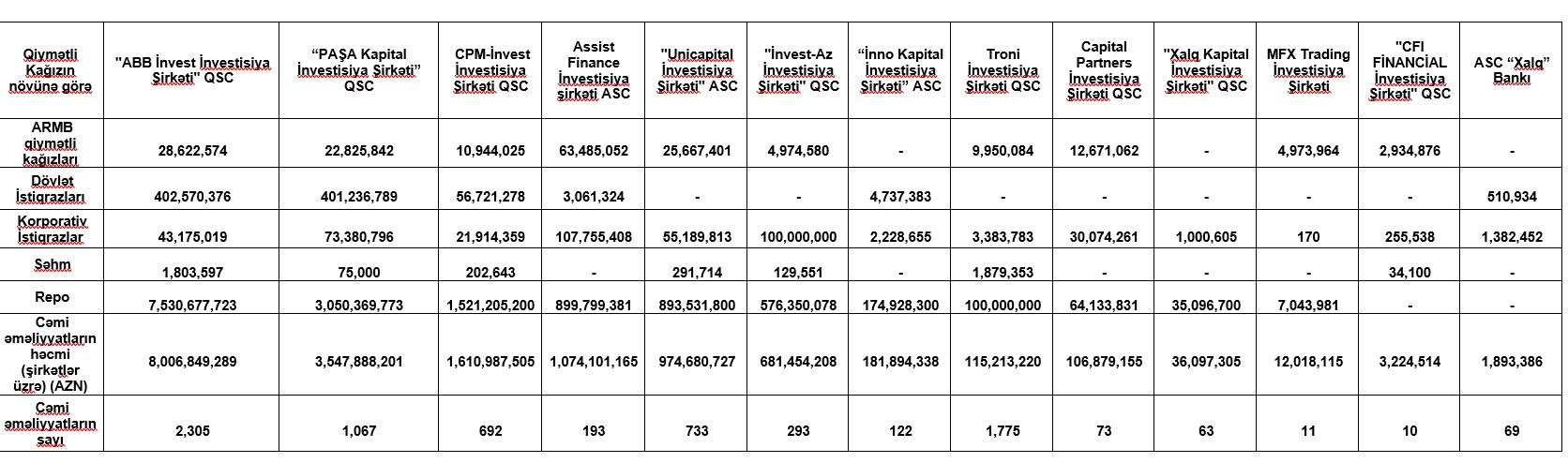Marja.az Birjaya istinadən xəbər verir ki, "ABB İnvest İnvestisiya Şirkəti" QSC  8 milyard 6 milyon 849 min manat əməliyyat həcmilə 1-ci yeri tutub.