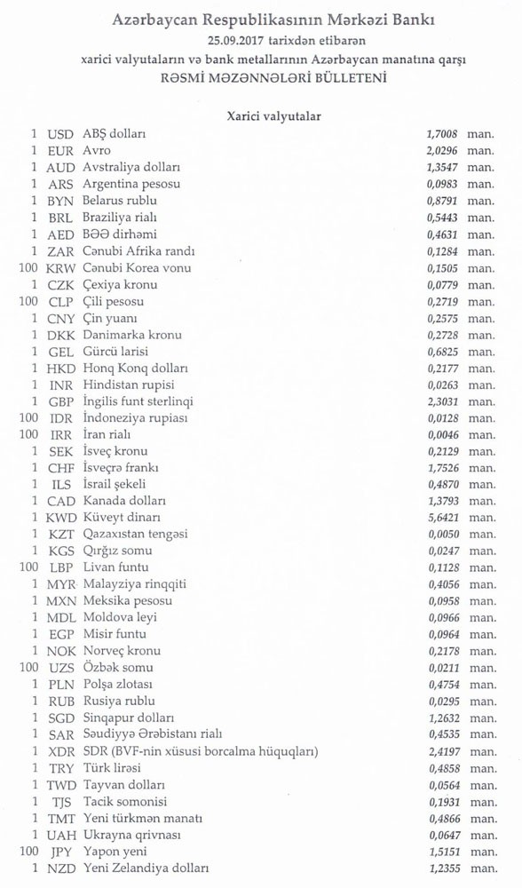 Sentyabrın 22-də rəsmi olaraq 1 dollar 1,7008 manata, 1 avro isə 2.0342 manata bərabər idi.