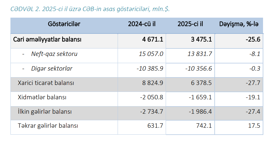 2025-ci il üzrə cari əməliyyatlar hesabının profisiti 3.5 mlrd.$ və ya ÜDM-in 4.6%-ni təşkil etmişdir (2024-cü il üzrə 4.7 mlrd.$ profisit olmuşdur). Neft-qaz sektoru üzrə CƏB-in profisiti 2024-cü ilə nəzərən 8.1% daralaraq 13.8 mlrd.$, qeyri-neft-qaz sektoru üzrə CƏB-in kəsiri isə 0.3% azalaraq 10.3 mlrd.$ məbləğində olmuşdur.