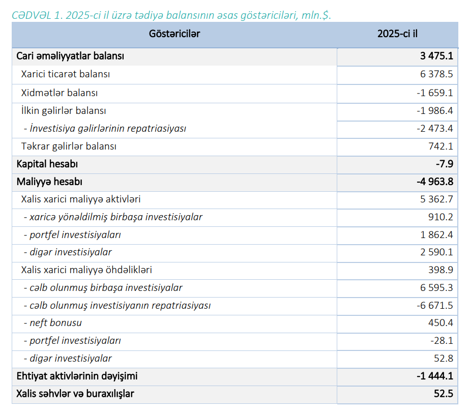 Qeyd edilib ki, 2025-ci il üzrə tədiyə balansı1 qlobal əmtəə, xidmət və maliyyə bazarlarındakı qiymət və indeks dəyişkənliyindən təsirlənmişdir. Cari əməliyyatlar balansında 3.5 mlrd.$ həcmində profisit formalaşmış, kapital və maliyyənin hərəkəti balansı üzrə xalis xarici maliyyə aktivləri 5.4 mlrd.$, xalis xarici maliyyə öhdəlikləri isə 0.4 mlrd.$ artmışdır.