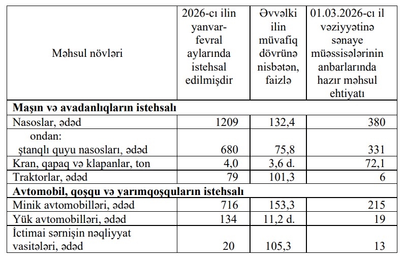 01.03.2026-cı il vəziyyətinə sənaye müəssisələrinin anbarlarında hazır məhsul ehtiyatı 215 ədəd olub.