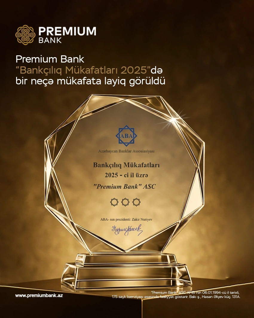 Premium Bank, Azərbaycan Banklar Assosiasiyası (ABA) tərəfindən təşkil olunan “Bankçılıq Mükafatları – 2025” təşəbbüsü çərçivəsində üç mühüm nominasiya üzrə mükafata layiq görülüb. Bankın fəaliyyəti kommersiya banklarının performansı və cəmiyyətə verdiyi töhfələr əsasında yüksək qiymətləndirilib.