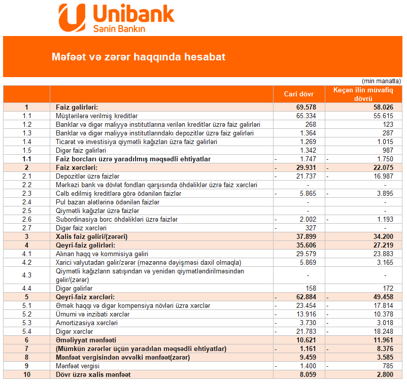Marja-nın məlumatına görə, Unibank 2026-cı ilin ilk rübünü 8 milyon 59 min manat xalis mənfəət ilə başa vurub. 2025-ci ilin eyni dövründə bu göstərici 2 milyon 800 min manat idi. Beləliklə, xalis mənfəət 5 milyon 259 min manat və ya 187,8 % (təxminən 2,9 dəfə) artıb.