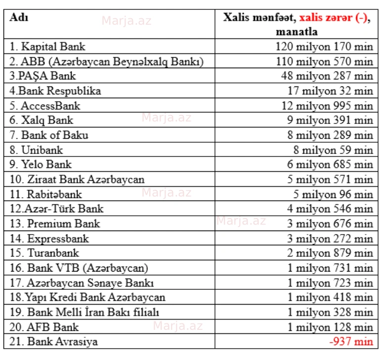 Bankların əldə etdikləri xalis mənfəət/xalis zərər məbləğinə görə SİYAHISI