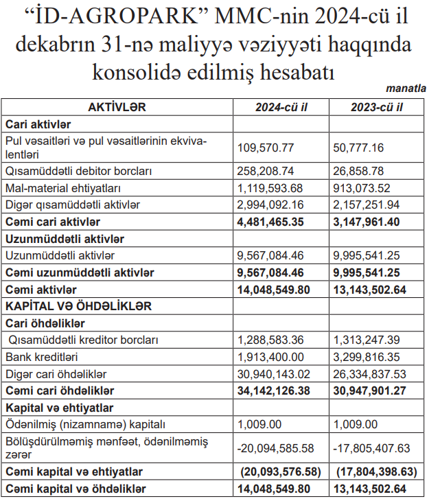 31 dekabr 2024-cü il tarixində “İD-AGROPARK” MMC 14 milyon 48 min manat cəmi aktivlərə, 34 milyon 142 min manat cəmi öhdəliklərə malik olub.