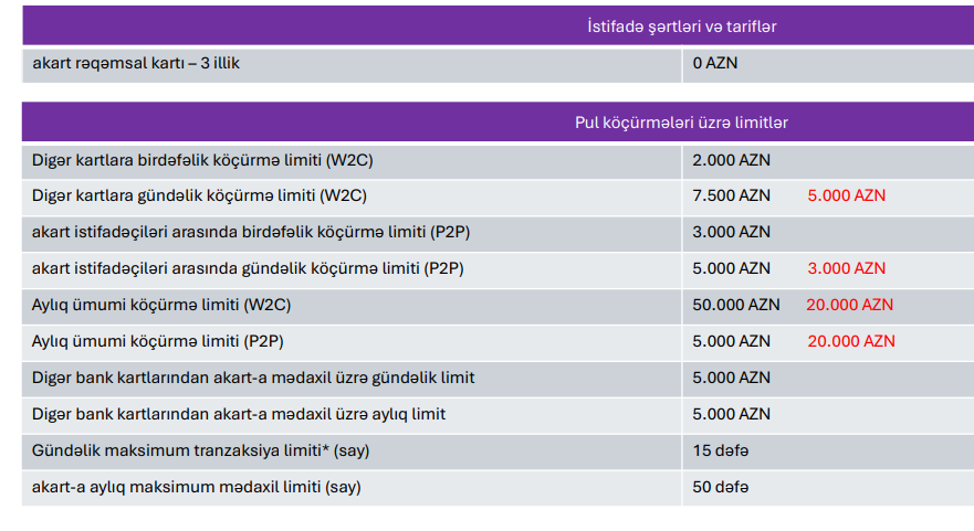 Marja.az-ın əldə etdiyi məlumata görə, pul köçürmələri üzrə limitlərdə - digər kartlara gündəlik köçürmə limiti (W2C) 7500 AZN-dən 5000 AZN-ə, kart istifadəçiləri arasında gündəlik köçürmə limiti (P2P) 5000 AZN-dən 3000 AZN-ə, aylıq ümumi köçürmə limiti (W2C - vasitəçi bank üzərindən digər bank kartlarına köçürmə) 50 000 AZN-dən 20000 AZN-ə endirilib.