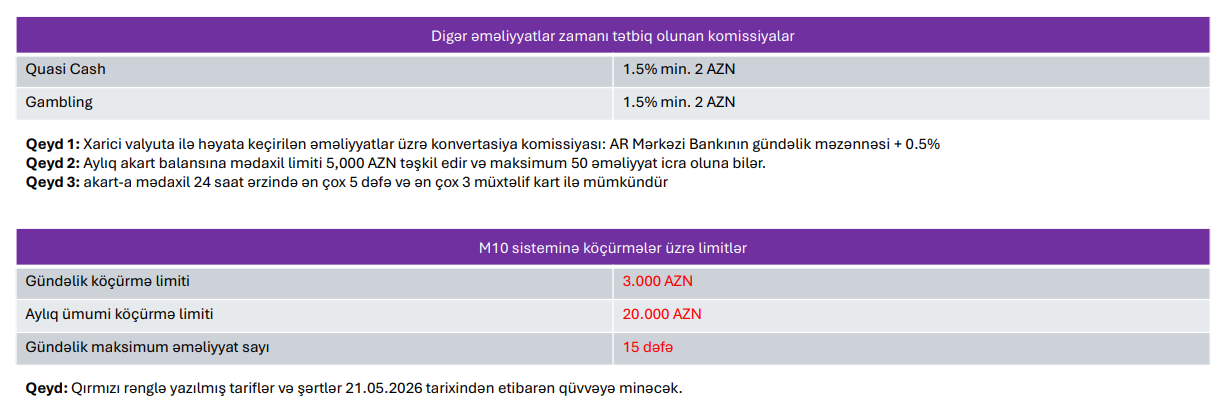 M10 sisteminə köçürmələr üzrə limitlərdə - gündəlik köçürmə limiti 3 000 AZN, aylıq ümumi köçürmə limiti 20 000 AZN, gündəlik maksimum əməliyyat sayı 15 dəfə müəyyənləşdirilib.