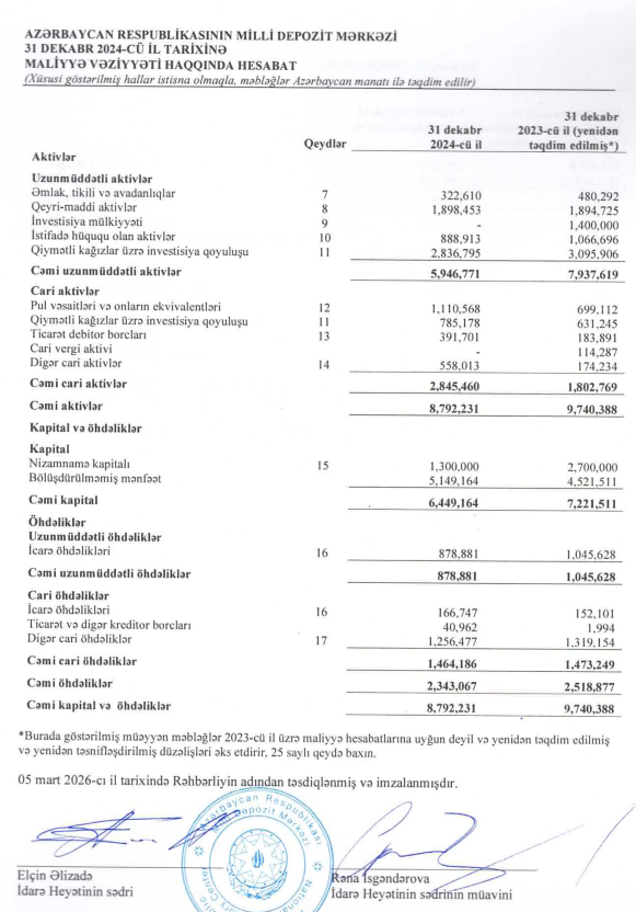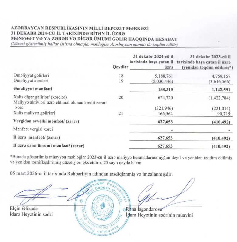 Milli Depozit Mərkəzi 2024-cü ildə 625 min manatlıq digər gəlirləri və 167 min manatlıq maliyyə gəlirləri hesabına xalis mənfəətə keçib.