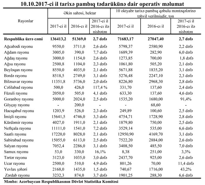 Dövlət Statistika Komitəsindən bildiriblər ki, bu, ötən ilin müvafiq dövrü ilə müqayisədə 2,7 dəfə çoxdur. Belə ki, keçən il oktyabrın 10-dək pambıq qəbulu məntəqələri 27 min 47,40 ton məhsul tədarük etmişdi.