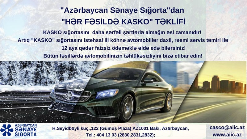 Azərbaycan Sənaye Sığorta ASC vətəndaşlara il boyu, istənilən hava şaraitində onların avtomobillərini qoruyacaq "HƏR FƏSİLDƏ KASKO" məhsulunu təklif edir.