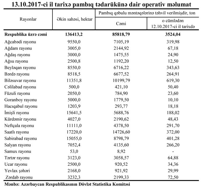 Dövlət Statistika Komitəsindən bildiriblər ki, oktyabrın 12-də 3524,04 ton pambıq tədarük olunub.